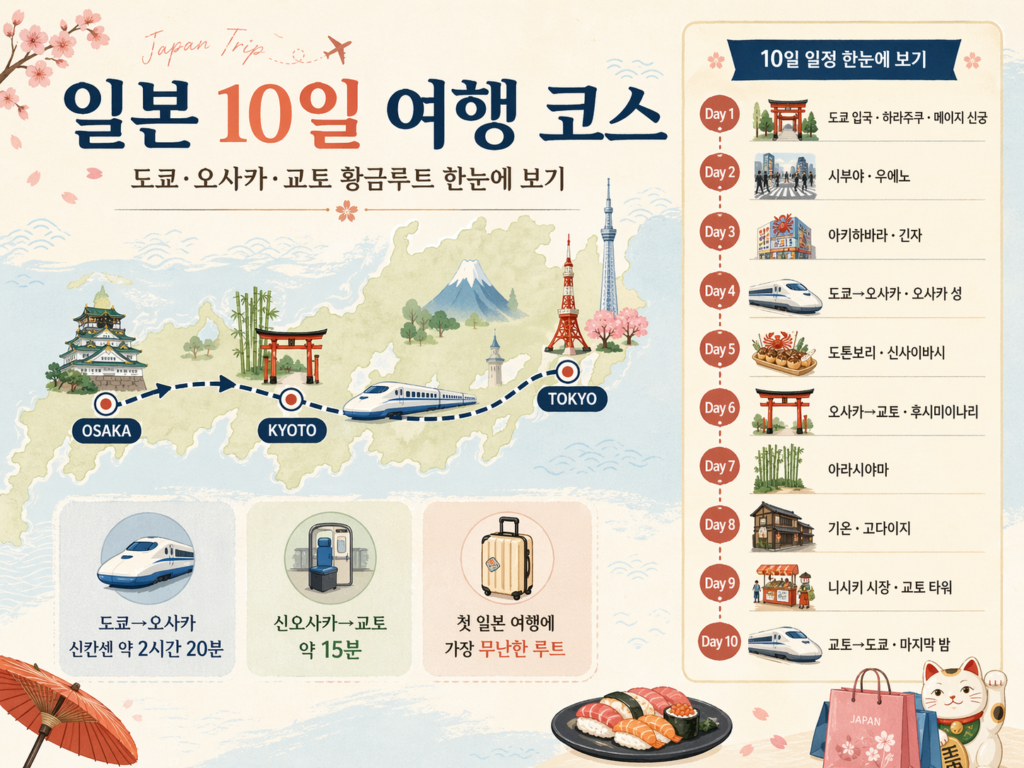 일본 10일 여행 코스를 짜기 시작하면, 대부분 같은 질문 앞에서 멈춘다. 도쿄만 갈까, 오사카·교토도 넣을까, 넣는다면 며칠씩 쪼갤까. 정답은 오래전부터 정해져 있다. 도쿄-오사카-교토를 한 번에 도는 ‘황금루트’ — 일본을 처음 가는 한국 독자에게 가장 실패 확률이 낮은 조합이다.