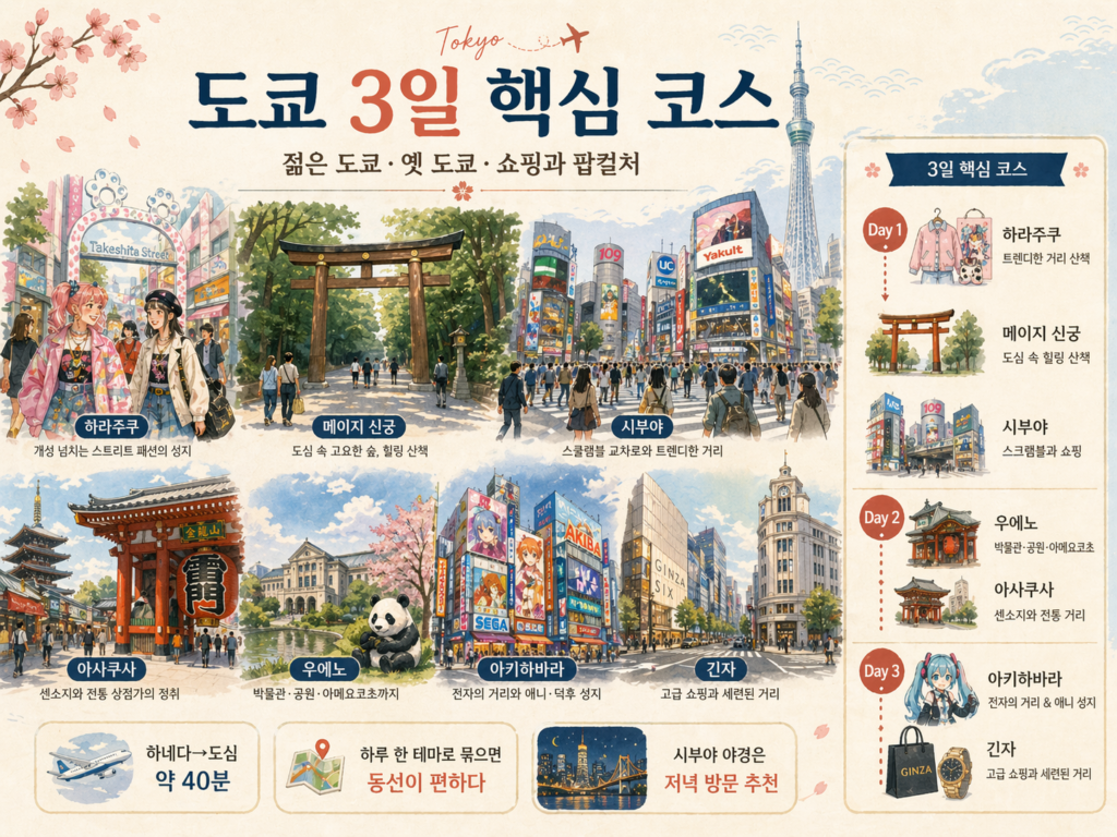 <!– 도쿄에서 시간이 남는다면 지브리 미술관(예약 필수)·도쿄 타워/스카이트리·쓰키지 장외시장·오다이바도 추가 후보. 3일 안엔 다 못 넣으니 선택 –>