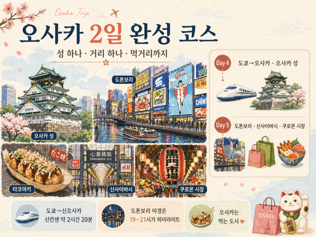 오사카는 “먹는 도시”다. 2일 안에 성 하나 + 거리 하나만 제대로 보면 성공이다.