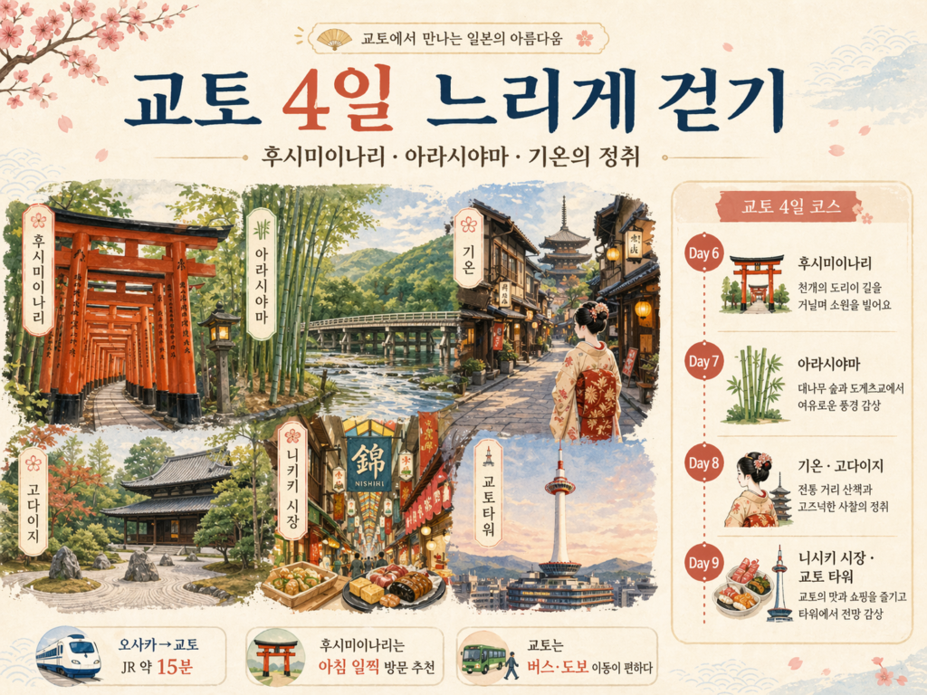 - ⛩️ 교토 하루 코스 — 새벽 후시미이나리부터 아라시야마까지 — Day 6~8 심화. 새벽 5시 반 기상부터 밤 9시까지, 교토의 가장 임팩트 있는 하루를 시간 단위로 설계.
