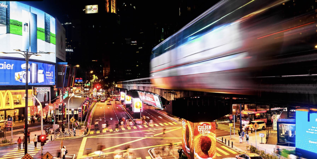 부킷 빈탕 모노레일역 주변의 고가 보도에서 찍을 수 있는 이 장면은, KL의 가장 "미래적인" 사진 중 하나를 만들어준다. 도로 위에 적힌 ‘Kuala Lumpur’ 텍스트와 지나가는 차량의 헤드라이트가 만들어내는 장노출 라이트 트레일의 조합이다.