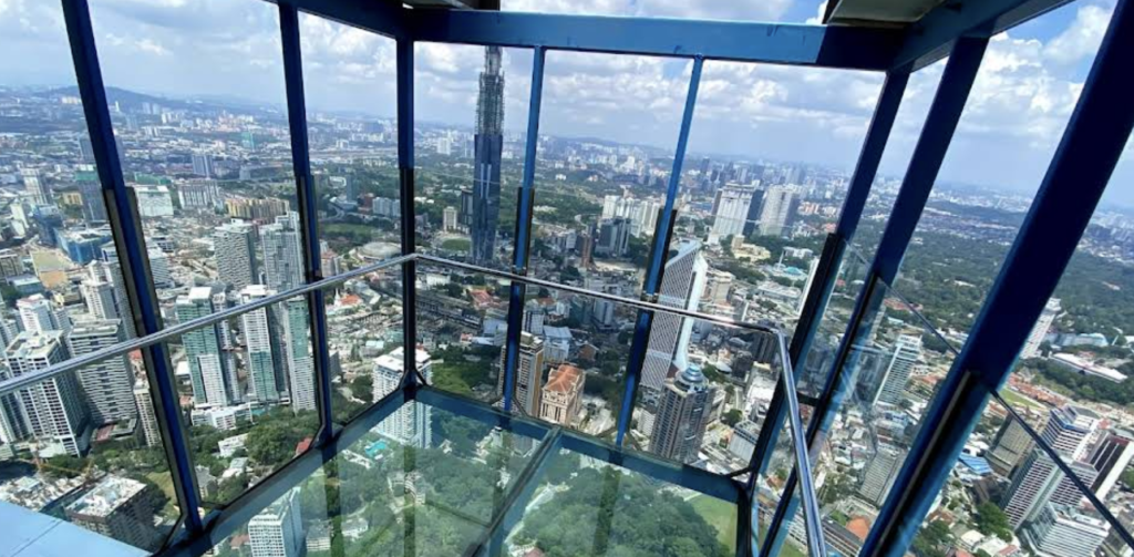 KL 타워(메나라 KL)는 전망대 자체보다 스카이 박스가 핵심이다. 타워 외벽에 돌출된 유리 바닥 위에 서서 KL 스카이라인을 배경으로 사진을 찍는 경험은 이 도시에서만 가능하다.