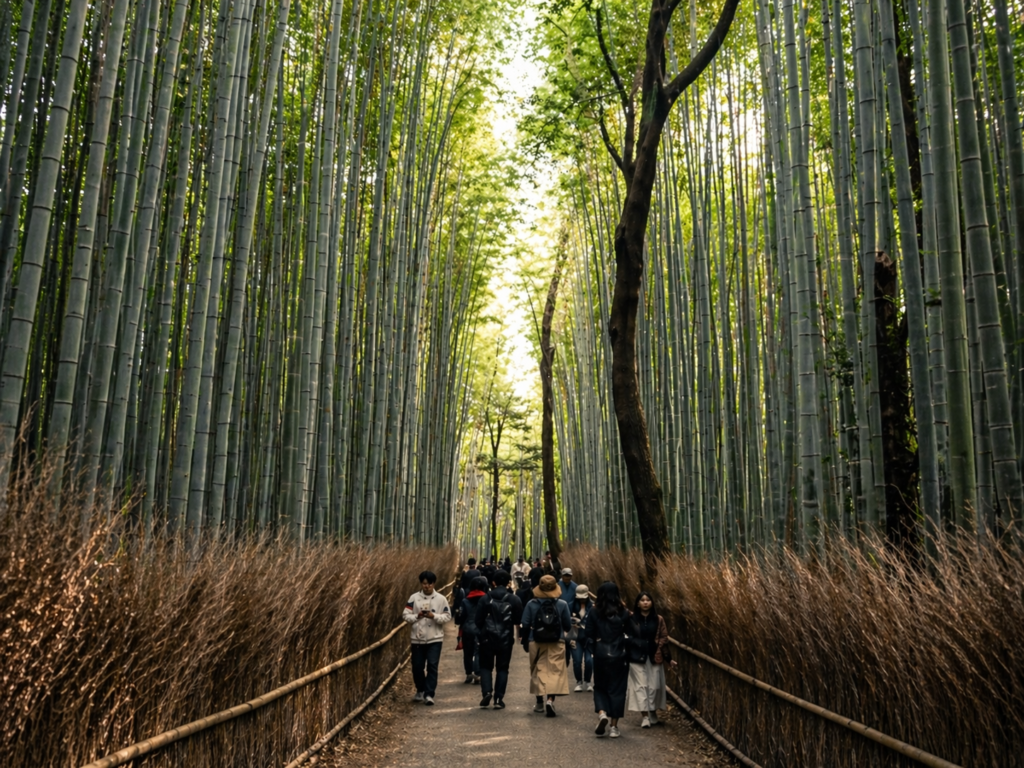 📍 아라시야마 대나무숲 — 교토시 우쿄구. Google Maps · 무료 · 24시간(조명 없음) · 9시 이전 또는 16시 이후 인파 피크 회피